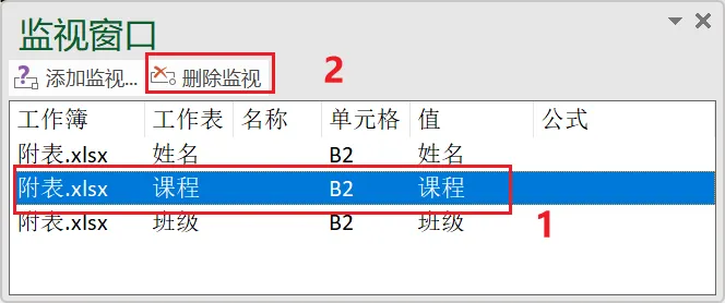 如果觉得有的目录不需要了,可以随时删除。比如,现在不需要 课程 表格的目录跳转了,选择 监视窗口 中列表的第二行,点击上方的 删除监视 按钮即可