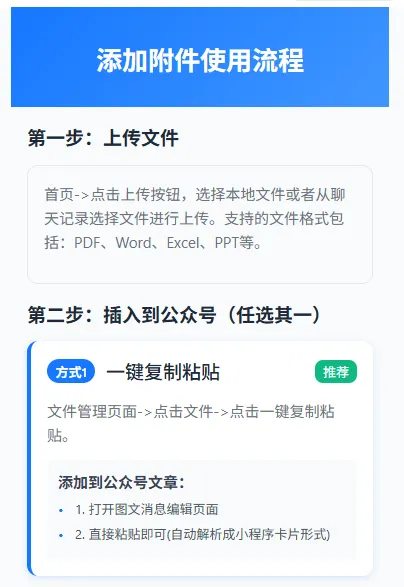 不管是教培机构分享课件讲义、招聘平台发布报名表、企业公示各类公告,还是社团发布活动通知,只要运营公众号,就绕不开上传附件的需求。