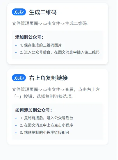 - 嵌入发布:复制生成的专属挂载链接,粘贴到公众号编辑器中,发布后读者即可点击查阅