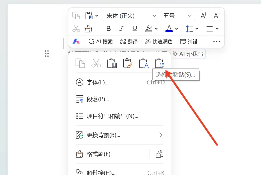 2、打开要将表格复制到的word文件,空白处右键---选择性粘贴