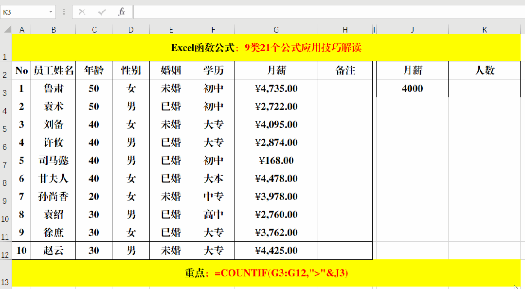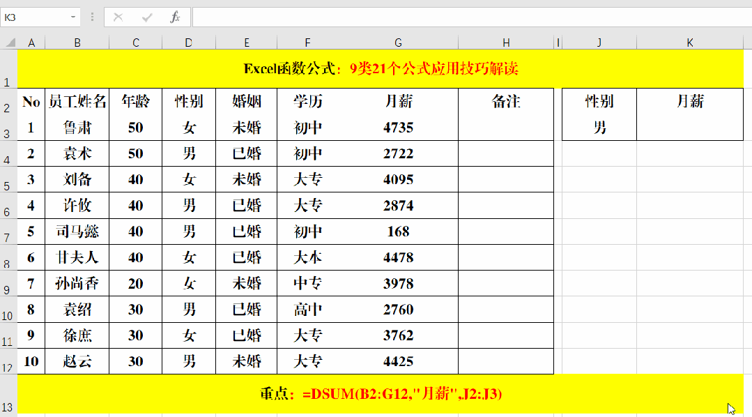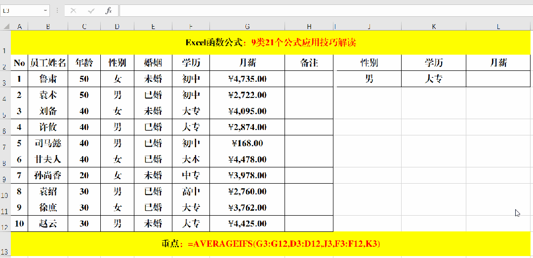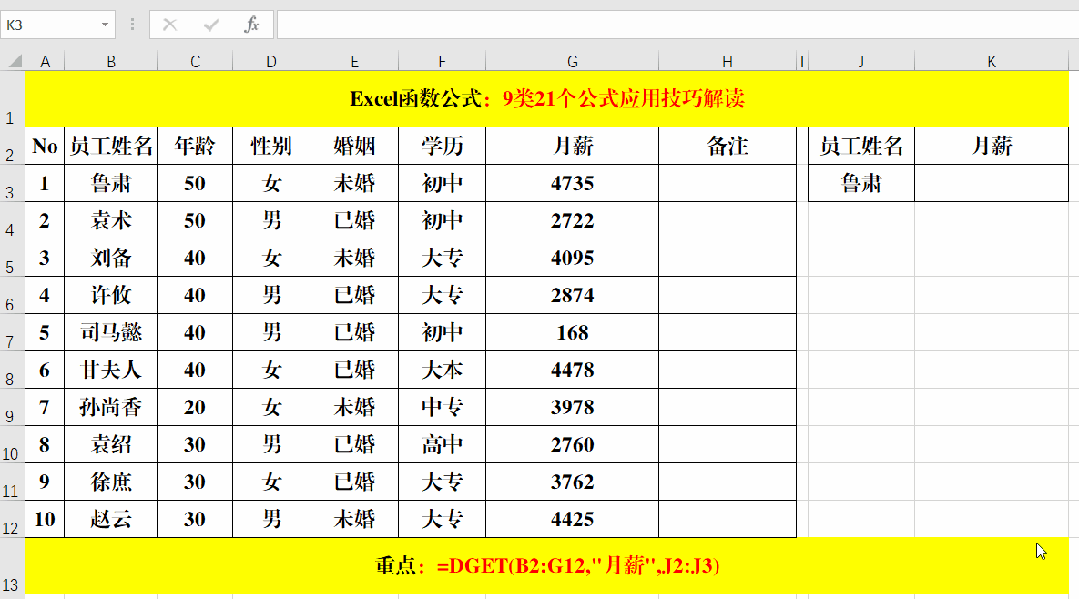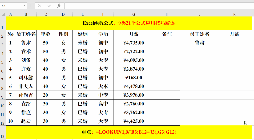 2)、在目标单元格中输入公式:=LOOKUP(J3,B3:B12,G3:G12)。