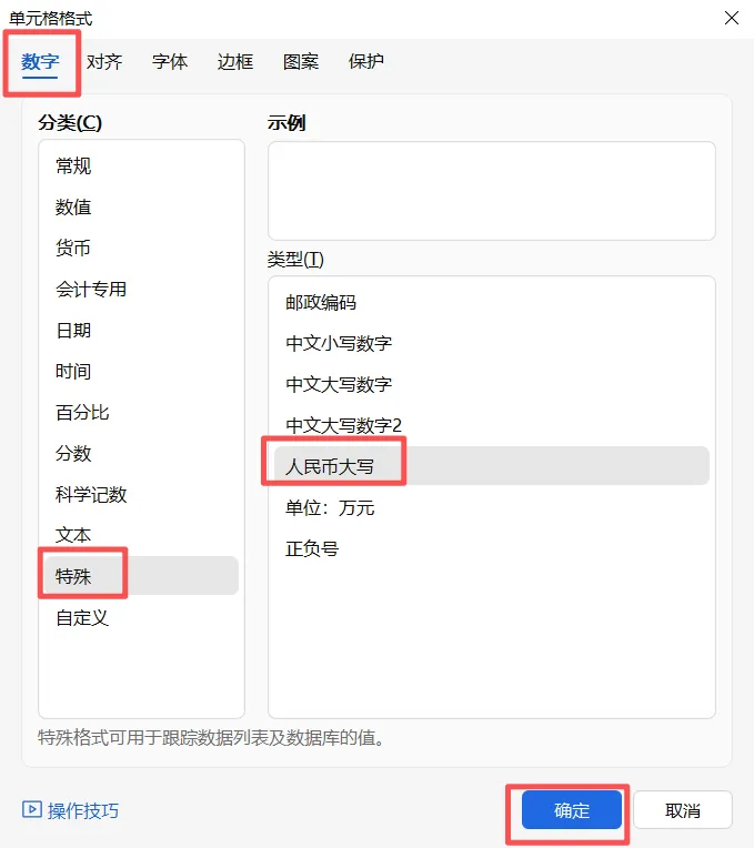 4. 打开单元格格式设置窗口,选择特殊,再选中人民币大写,点击确定。
