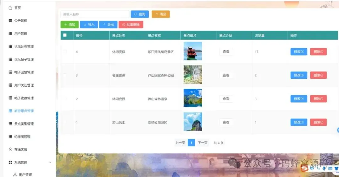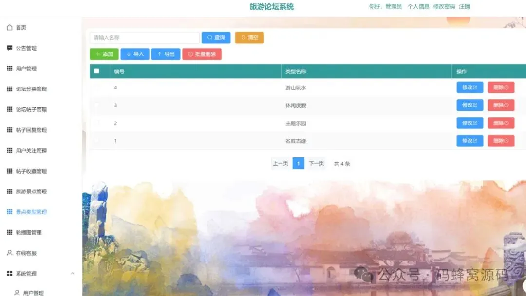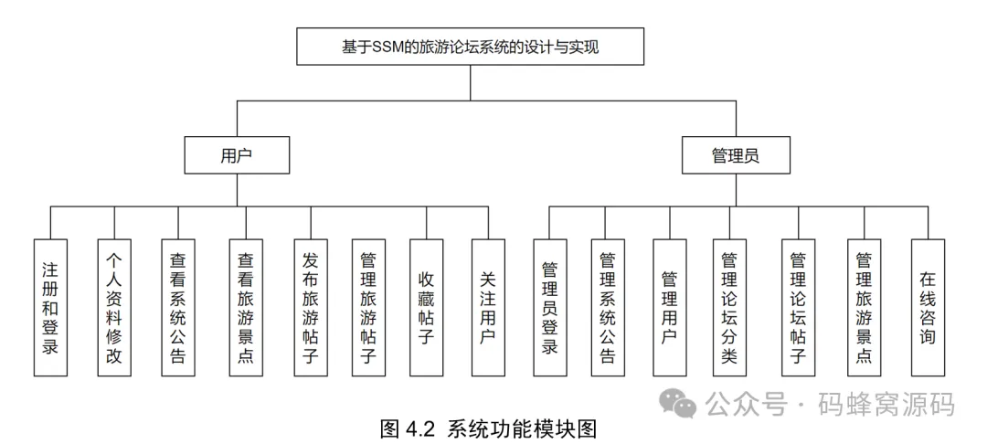 旅游论坛系统包括用户登录注册、个人咨询修改、查看系统公告、查看旅游景点、发布旅游帖子、管理旅游帖子、收藏帖子、关注用户等模块。整个系统的功能模块设计如图: