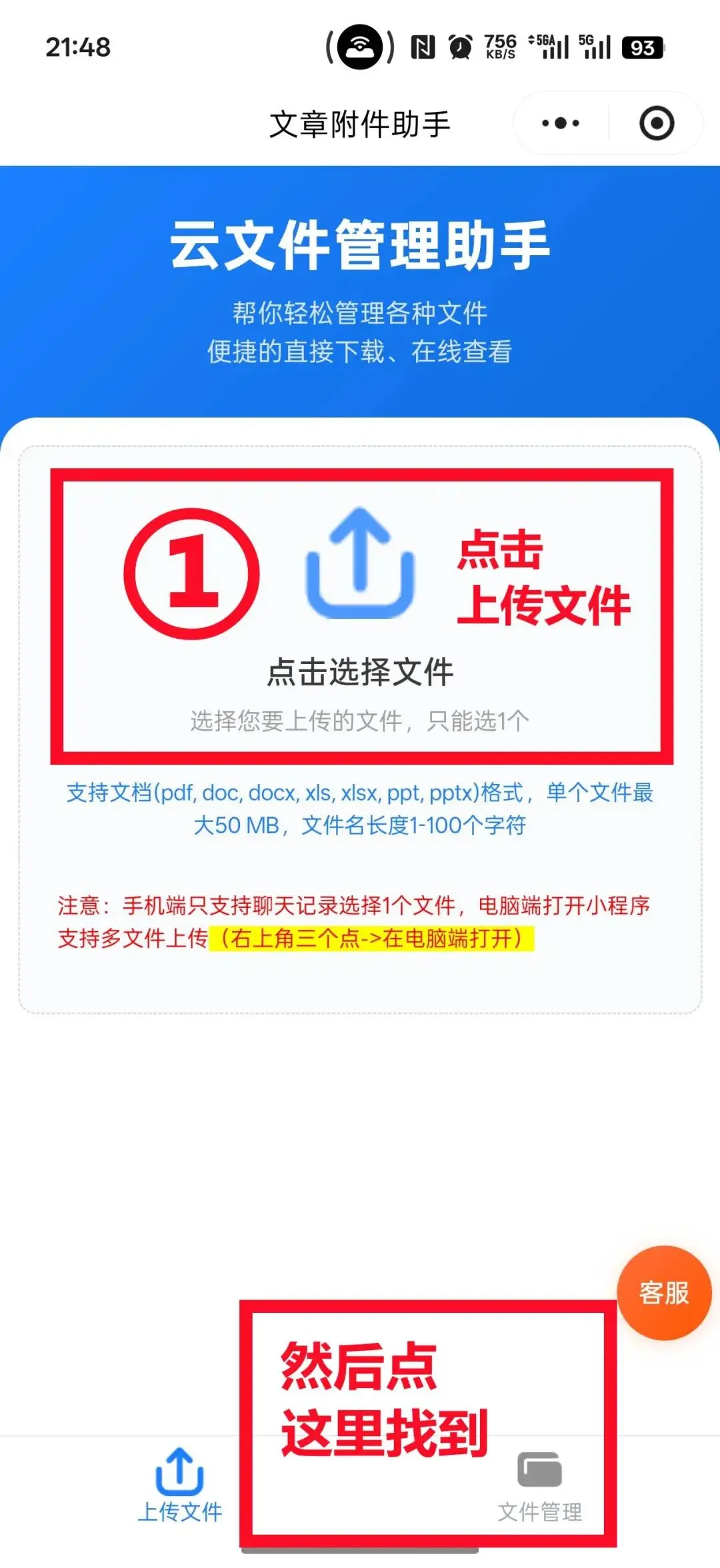 微信搜「文章附件助手」小程序,进入首页后点击上传文件,支持从本地和聊天记录选择文件上传,上传成功后进入文件管理页面,准备复制链接;