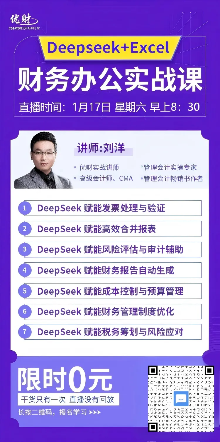 ※《EXCEL带你玩转财务职场》畅销书作者(京东财务类书籍销售量领先)刘洋老师历经十余年大型国企财务管理历练,担任财务经理期间,对基础核算、合并报表、财务分析、全面预算、资金管理、制度建设、商业模式设计等方面都积累了丰富的实战经验。曾担任某市金融与财务协会理事,并取得高级会计师、CMA美国注册管理会计师、重点大学会计学硕士等证书,出版四本财务畅销书。听课学员已超过10万人,学员好评不断。2.开课当天(2026年1月17日)8:30截止报名扫码即可报名【DeepSeek+Excel财务办公实战课】直播👇扫描下方二维码入群 还可0元领deepseek资料👇2. 本课程报名时间截止到2026年1月17日早8点半,截止后只能付费99元购课;3. 本课程为优财内容服务,课程咨询微信:yccma002。