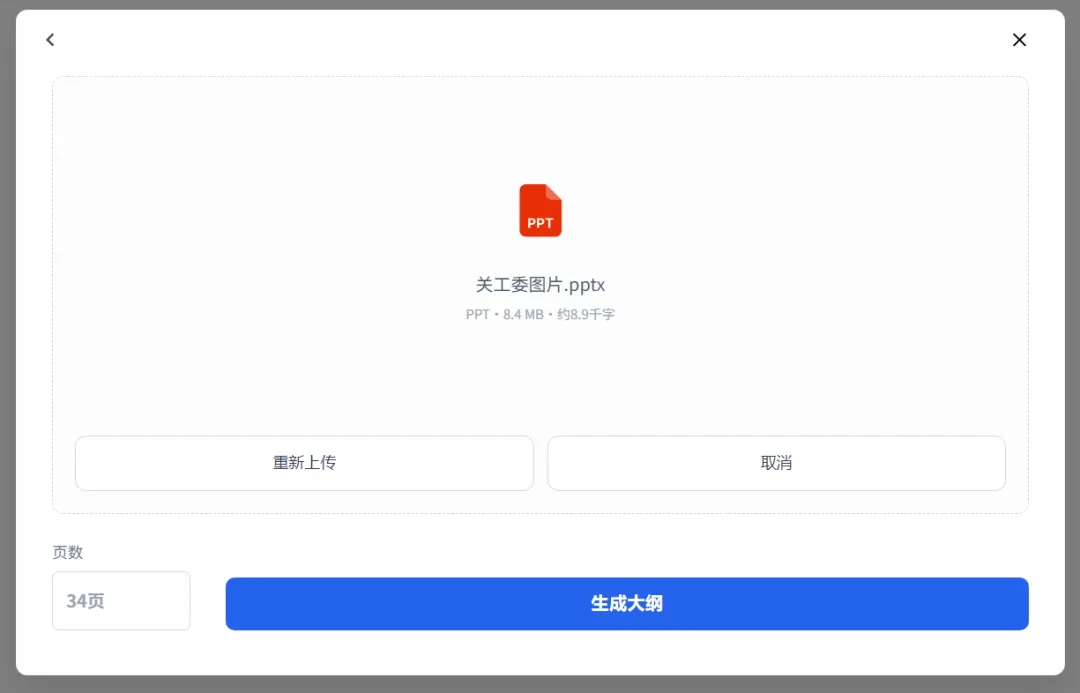 等待 PPT 上传好之后,就可以点击生成大纲让 AI 读取并分析 PPT 内容了