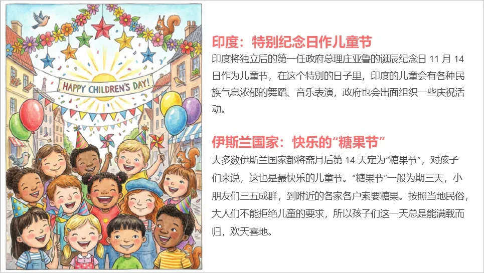 又比如这张原本丑到不能再丑的儿童节 PPT(但这类PPT又是网上最常下载到的)