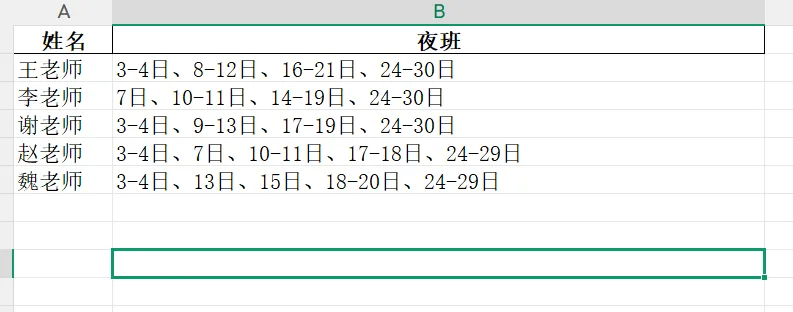 ✅ 手里一份标准Excel排班表,要挨个核对每位老师/员工的「夜班」日期,手动摘抄到新表格;
