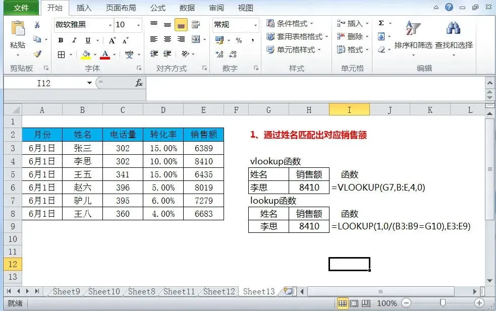 =LOOKUP(1,0/(B3:B9=G10),E3:E9),同样能精准得出 “李思” 的销售额 8410。
