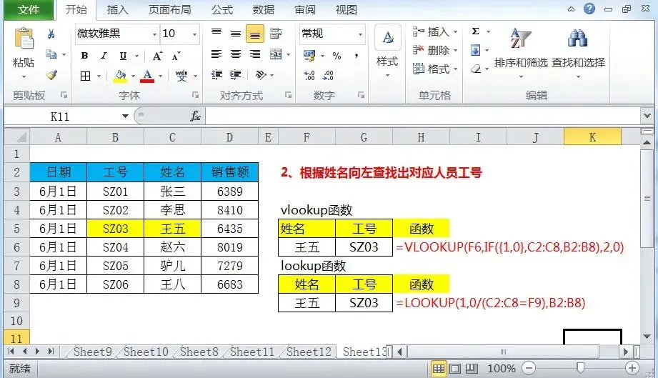 =VLOOKUP(F6,IF({1,0},C2:C8,B2:B8),2,0),才能匹配出 “王五” 对应的工号 SZ03。 - LOOKUP 函数:无需复杂嵌套,直接调整查找列参数即可,公式为