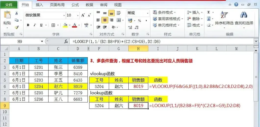 ={VLOOKUP(F6&G6,IF({1,0},B2:B8&C2:C8,D2:D8),2,0)},才能匹配出 “SZ04 + 赵六” 对应的销售额 8019。 - LOOKUP 函数:直接用 * 符号连接多个条件,公式为