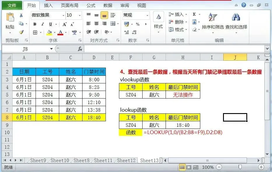 =LOOKUP(1,0/(B2:B8=F9),D2:D8) 可直接提取出 “SZ04” 工号对应的最后一次门禁时间 18:40。