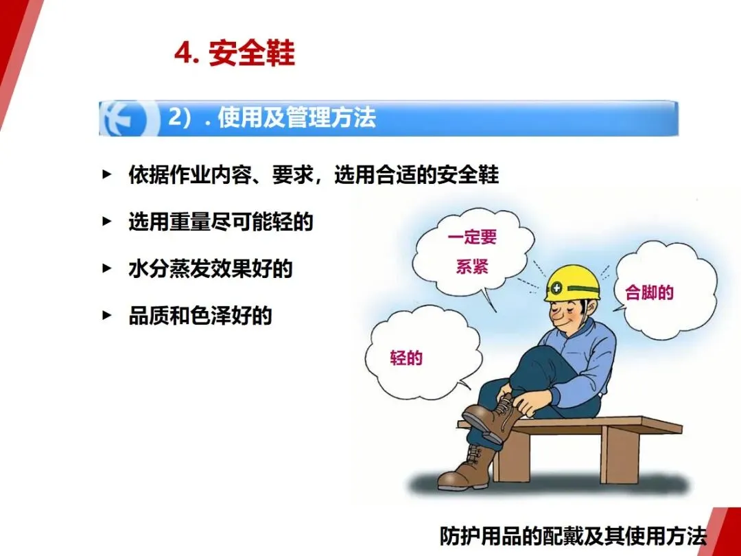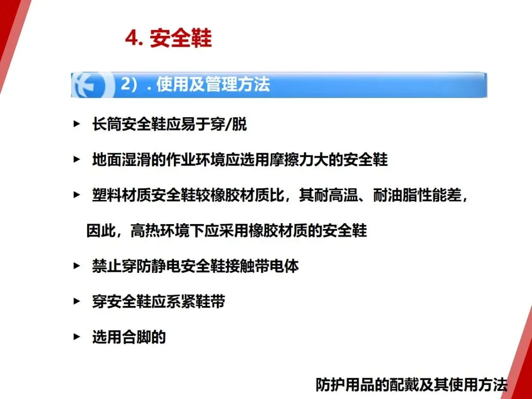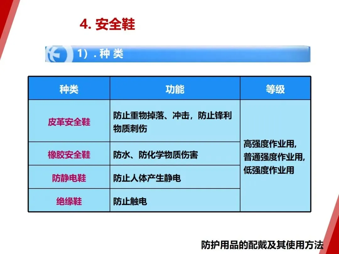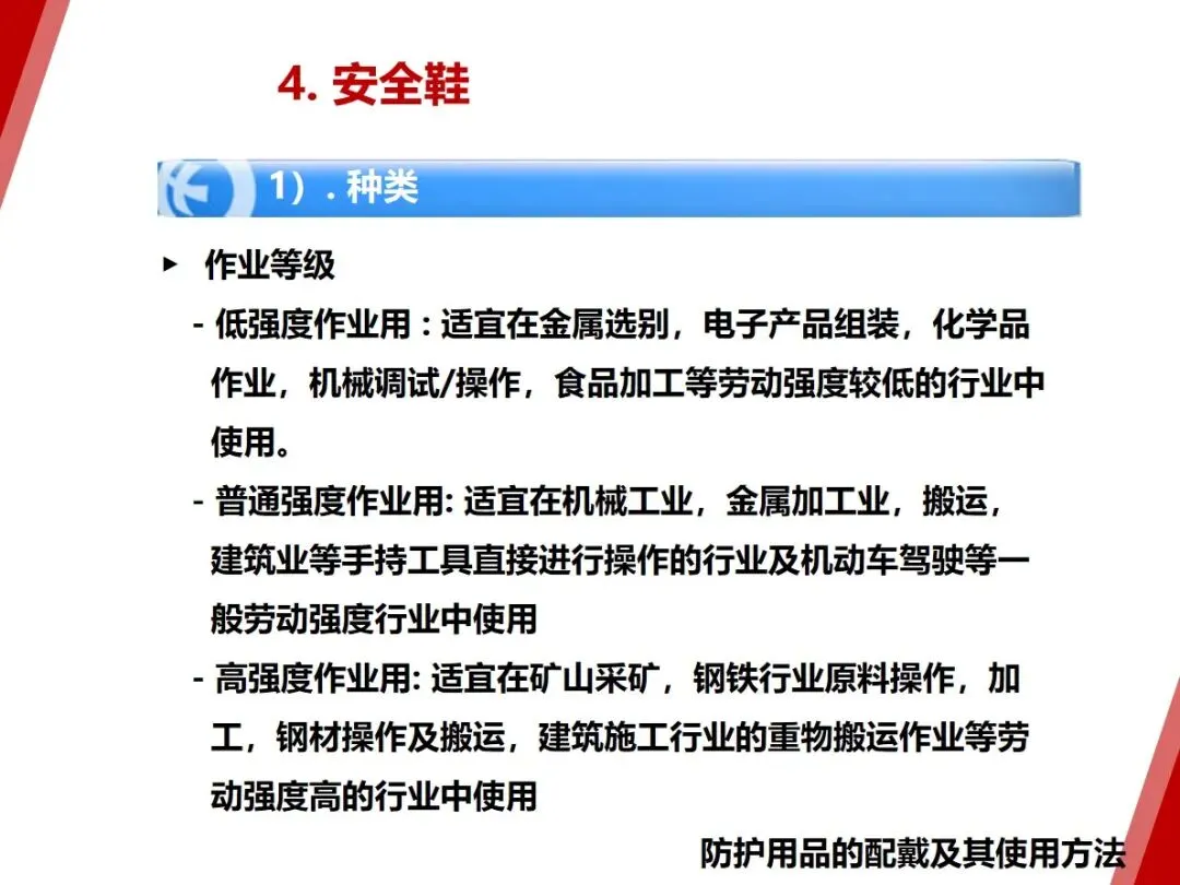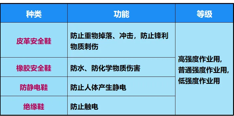 安全鞋按材质分皮革、橡胶、防静电、绝缘款。皮革款防砸防刺穿,分高、中、低强度,适配矿山、机械加工、电子组装等不同行业;橡胶款防水防化学伤害,防静电款避免人体带静电,绝缘款防触电。选鞋要合脚轻便、透气好,地面湿滑选摩擦力大的,高温环境优先橡胶材质,穿时务必系紧鞋带,防静电鞋不能接触带电体。