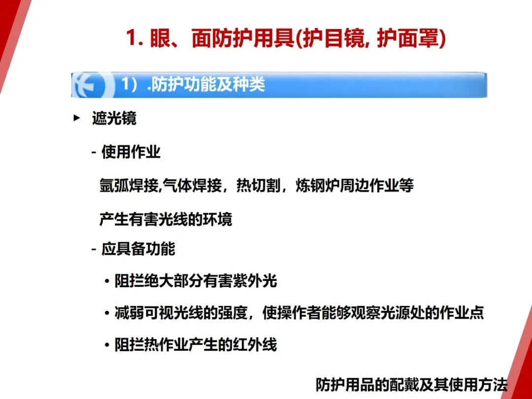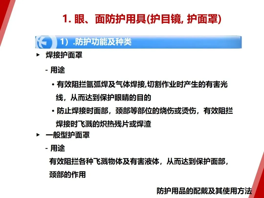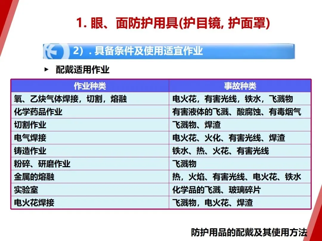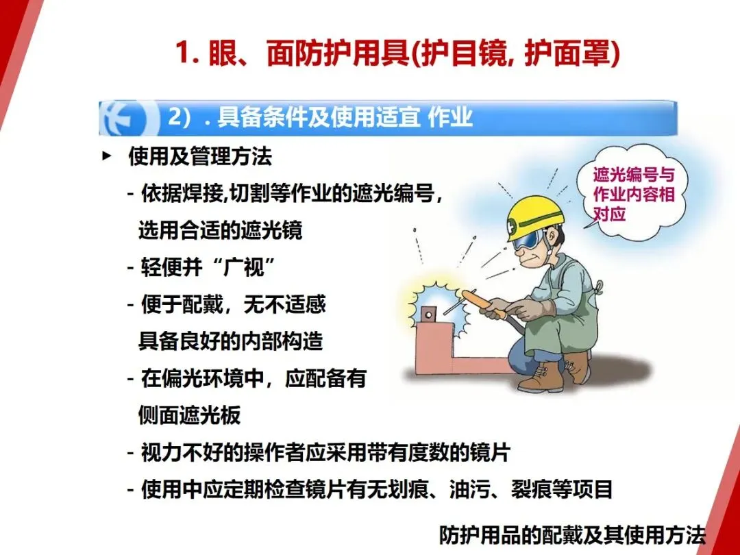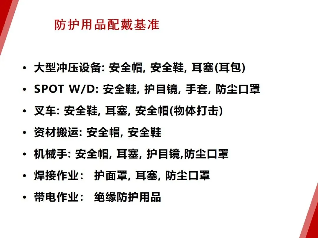 不同作业要配对应的防护用品:操作大型冲压设备,得戴安全帽、穿安全鞋,再配上耳塞或耳包;SPOT W/D 作业,安全鞋、护目镜、手套和防尘口罩一样都不能少;开叉车要穿安全鞋、戴耳塞和安全帽,防范物体打击;搬资材重点防护头部和脚部,安全帽、安全鞋是必备;机械手作业需叠加耳塞、护目镜和防尘口罩;焊接时得戴护面罩、耳塞和防尘口罩,隔绝有害光线和烟尘;带电作业必须专用绝缘防护用品。