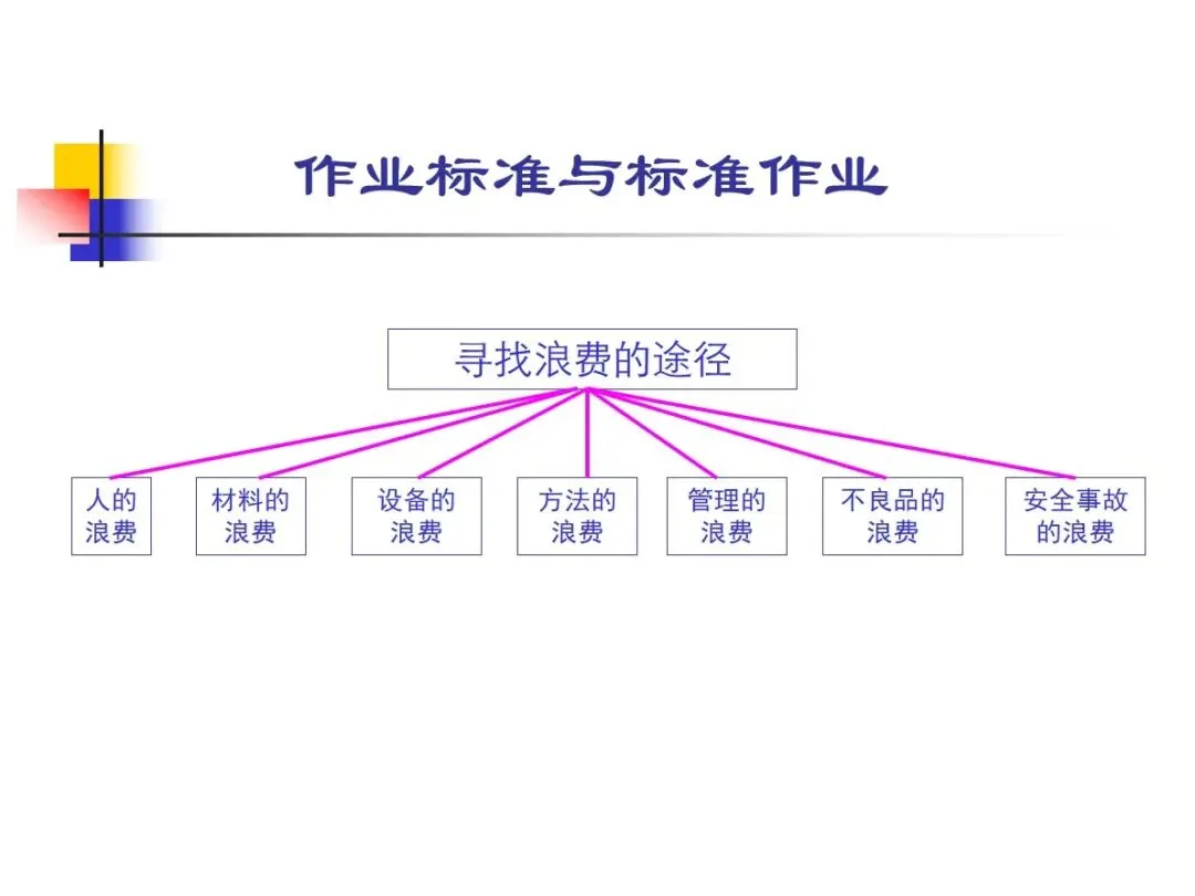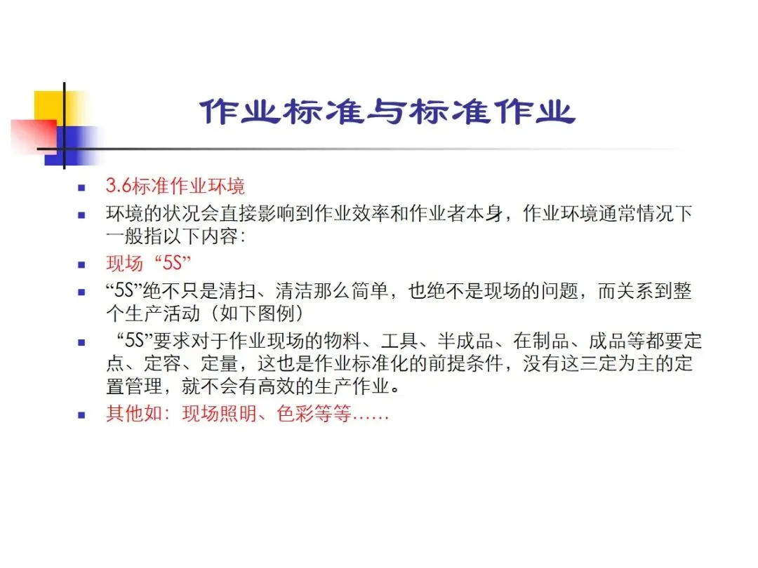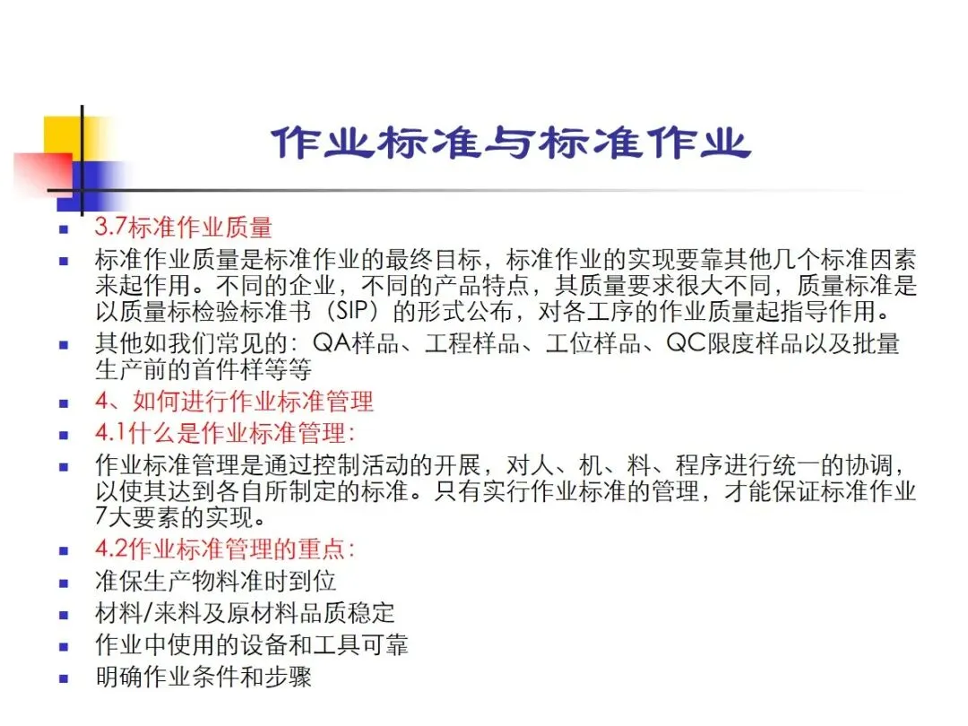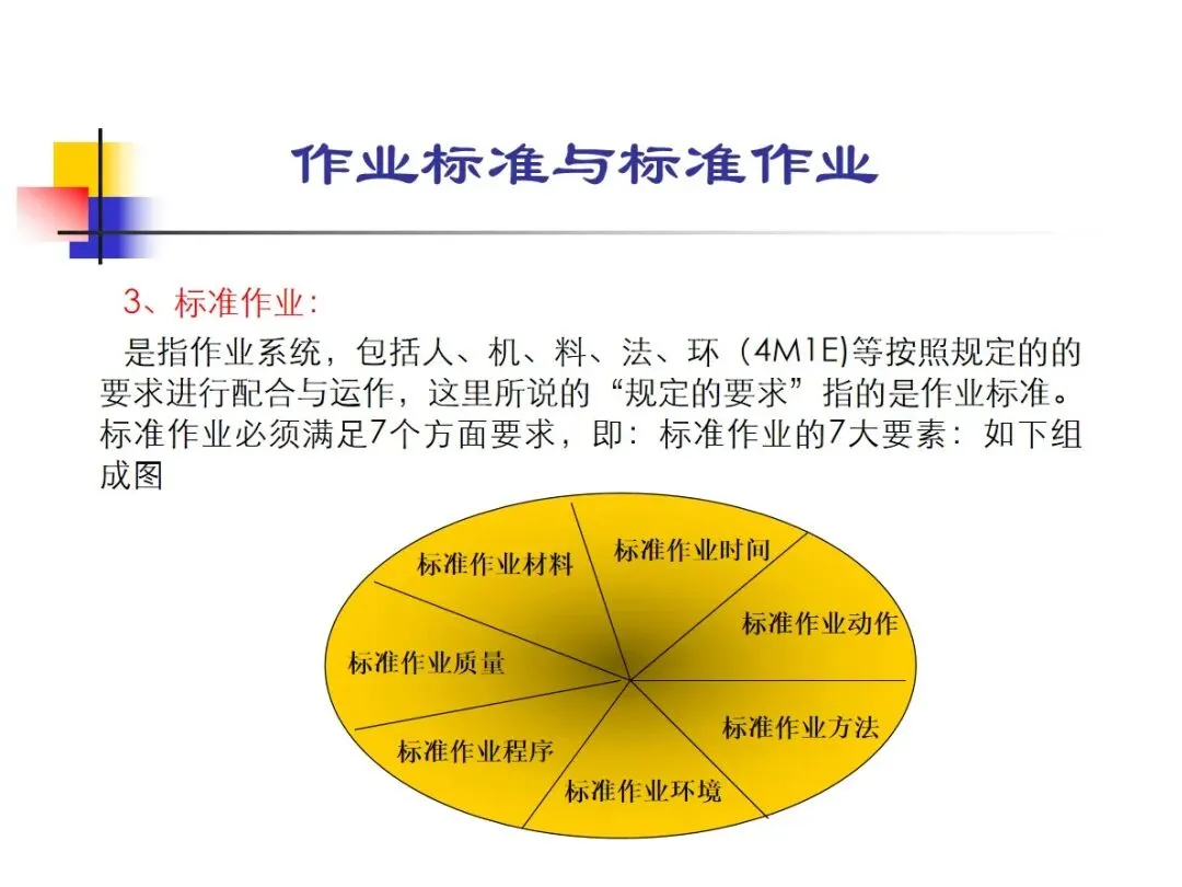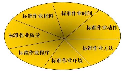 标准作业是指人、机、料、法、环(4M1E)各要素在作业体系中根据作业标准协调工作的标准化模式,它的实施需要7个核心要素的满足。