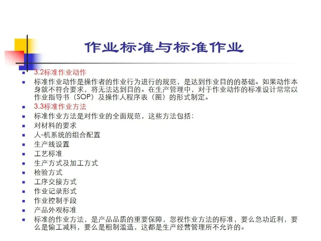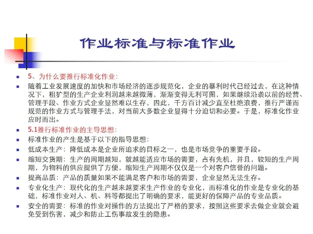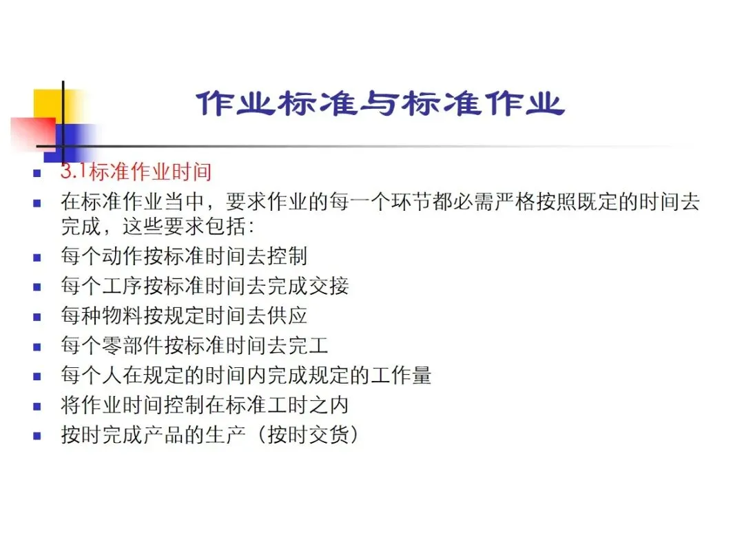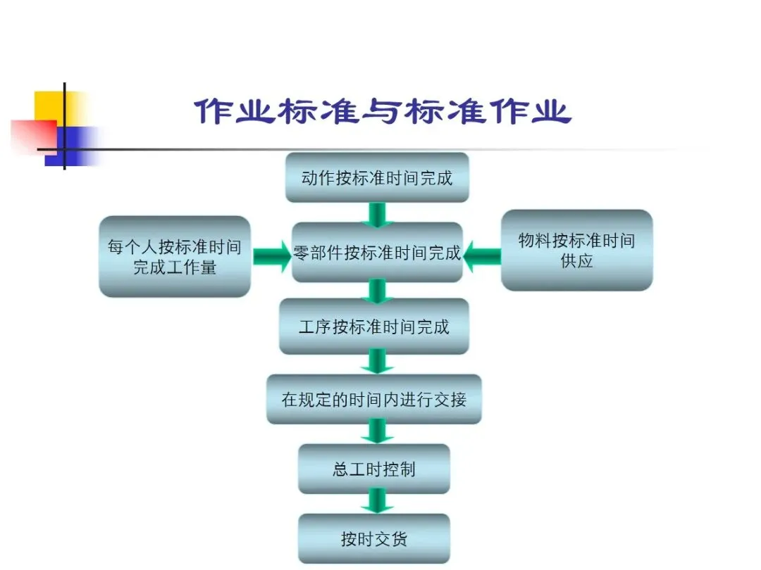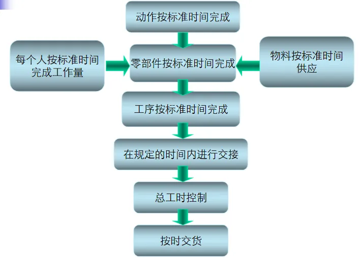 标准操作时间是指从操作控制到工序交接,从材料供应到零件完工,从人员完成工作量到产品交付,所有的操作过程都要严格按照规定的时间进行,从而保证产品的准时交付。标准操作行为是指通过SOP和操作规程表来规范操作人员的行为,并以此为基础来实现操作目标。标准操作方法是对材料要求,人机配置,生产线设置,工艺标准,检验手段等各个环节的全面规范,是对产品质量的直接保证,也是对急功近利,偷工减料行为的有效遏制。