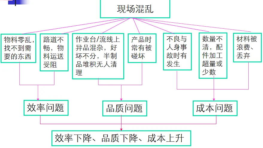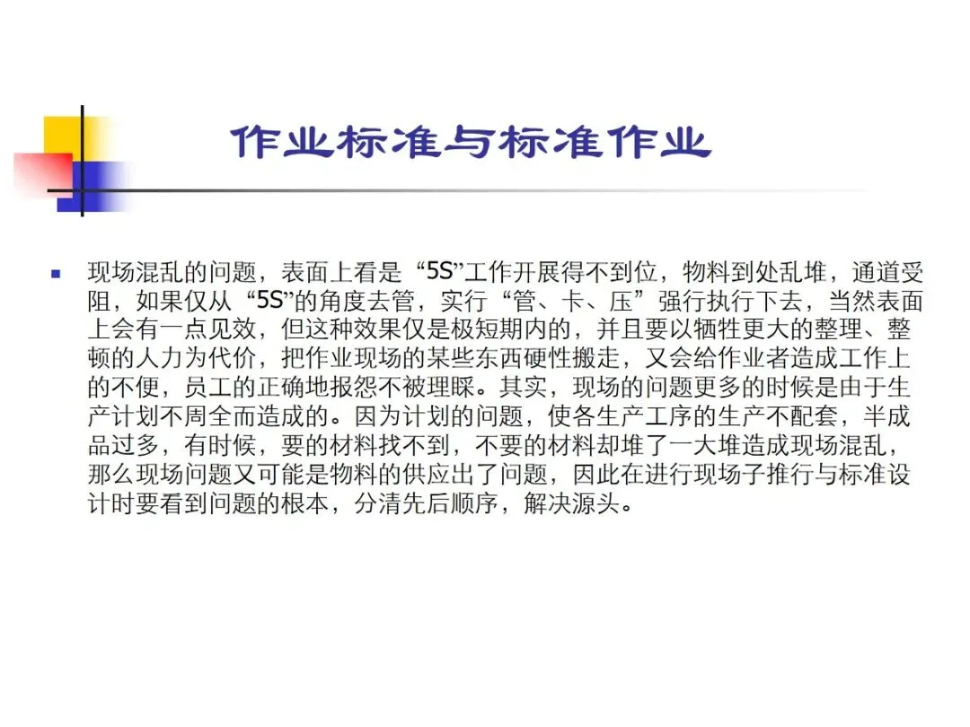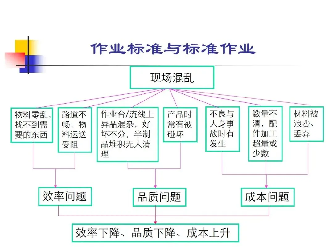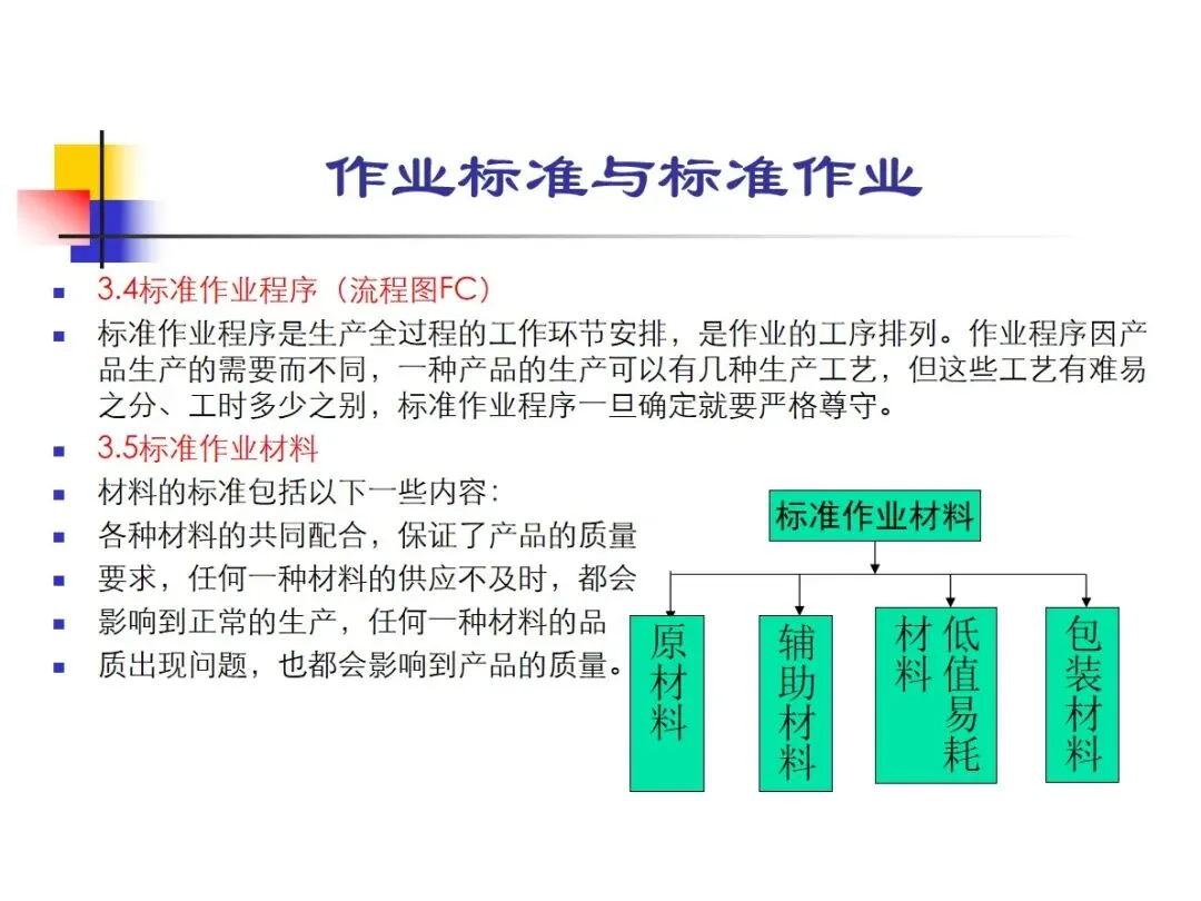 标准操作程序(FC流程图):明确的生产流程安排,根据产品要求的不同可能有多种流程,一经制定,必须严格执行。标准作业物料包括原料、辅料、低值耗材、包装物料等,它们的供应的及时性和质量的稳定性对生产的进度、产品的质量都有很大的影响。标准工作环境的核心是“5 S”现场管理,对物料、工具等进行定点、定量、定空间的摆放,并配以适当的灯光、颜色等,使工作环境不会因杂乱而降低效率、增加成本。以标准操作品质为终极目标,以品质检查规范书与各种样本为依据,引导各制程品质控制。