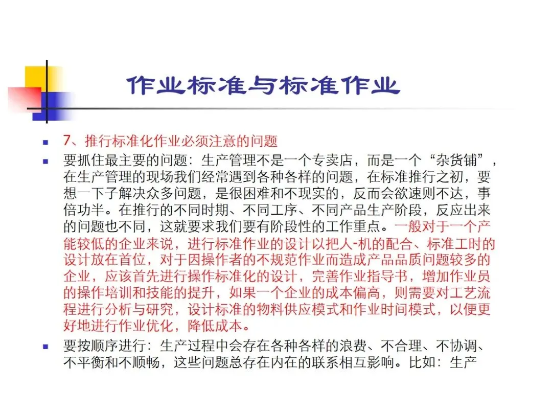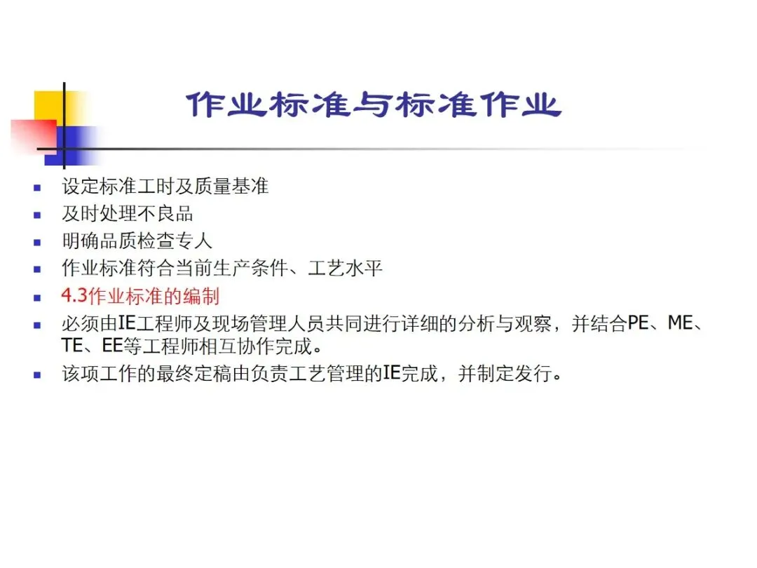标准作业管理需要协调人、机、料、程序,重点是保证材料的到位,设备的可靠,操作步骤的清晰,工时和质量的基准的清楚,以及不良产品的及时处理。编制过程中需要IE工程师,现场经理和多个专业的工程师共同参与,最后 IE工程师进行最后的审定和发布。