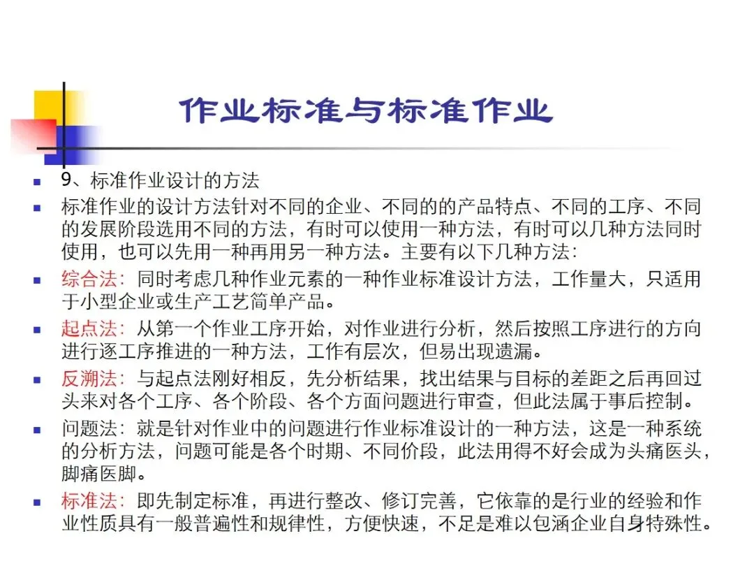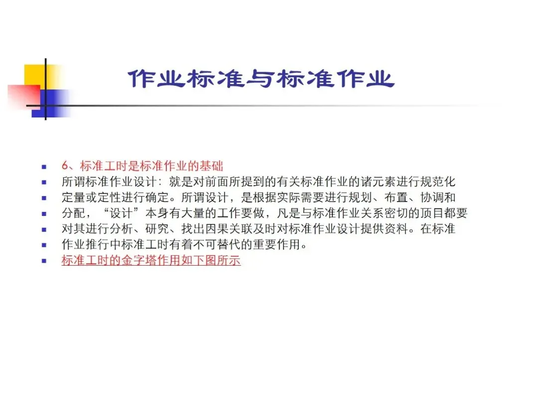 在目前的市场环境中,粗劣的生产模式已经无法维持,而标准化操作的实施可以降低成本,缩短交货期,提高质量,专业化生产和安全,同时减少人力、机器、材料和管理上的浪费。标准工时是支持生产线设计,产能计划,人员编制等工作的核心基础。在实施过程中,要突出重点,循序渐进,从源头上解决问题,在设计方法上,要结合企业实际,选择综合法、起点法、回溯法,做到灵活变通,适应不同的场景,帮助企业实现高效率生产。