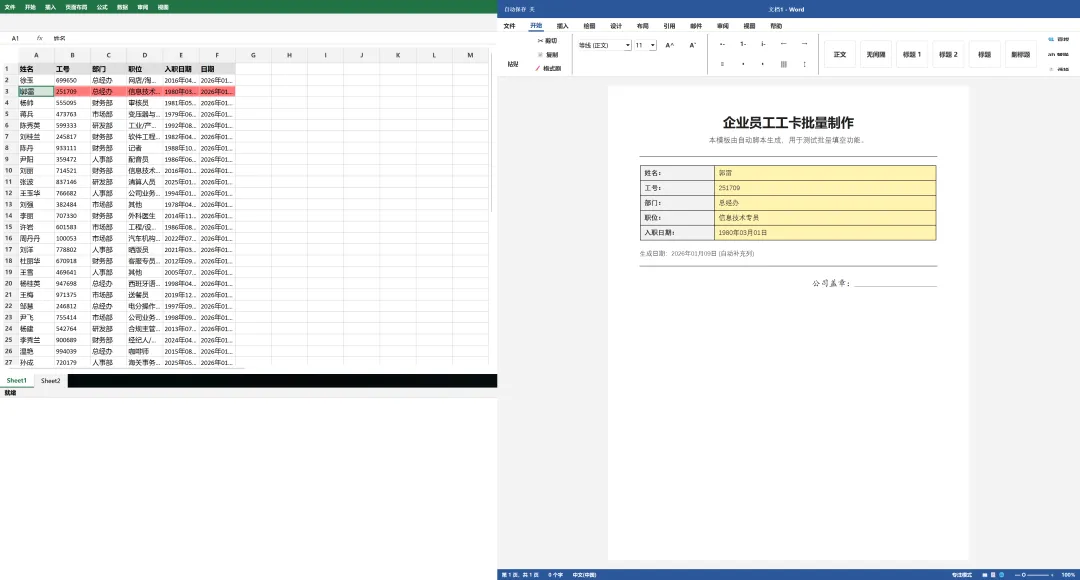 导入素材:分别点击按钮选择你的 Excel 数据表 和 Word 模板文件(.docx)。