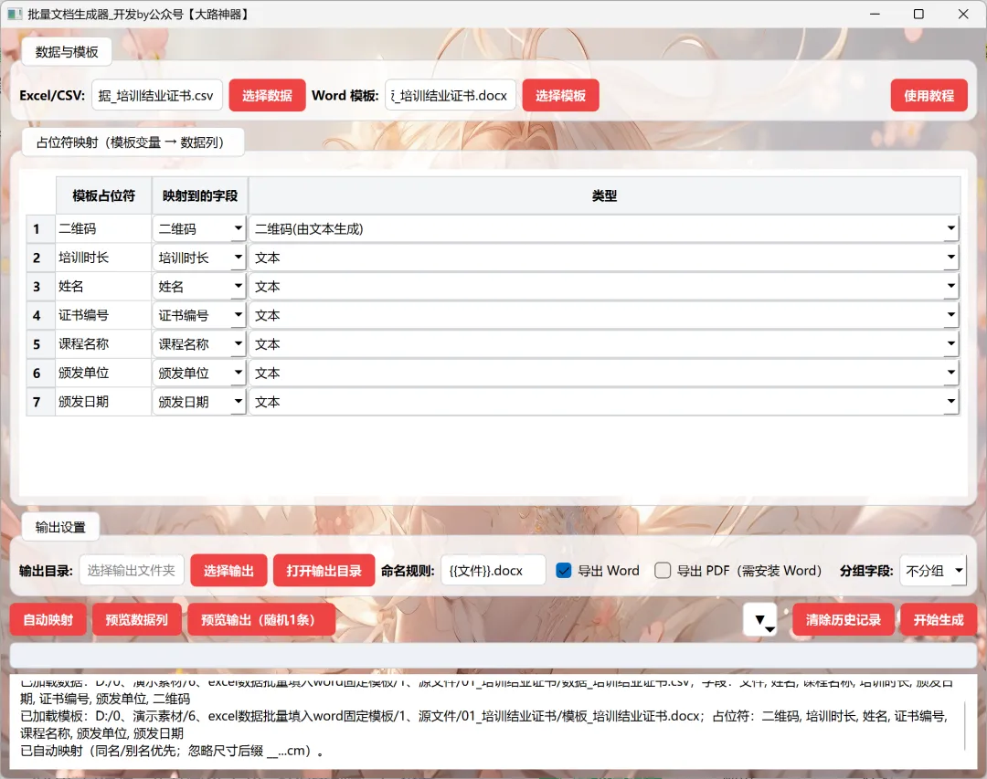 建立连接:点击 “自动映射”,程序会自动把 Excel 列名和 Word 里的 {{占位符}} 对上号。
