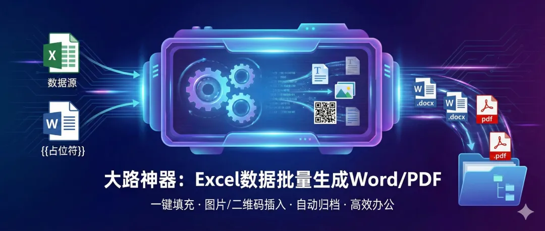 工具简介:本工具专为从繁琐的复制粘贴中解脱而生。只需一个 Word 模板 + 一份 Excel 名单,即可批量生成合同、证书、通知书、工牌等文档。支持自动插入图片、生成二维码,并可一键导出 PDF。