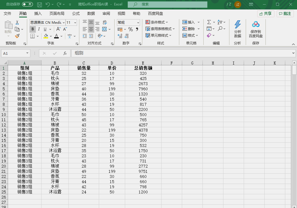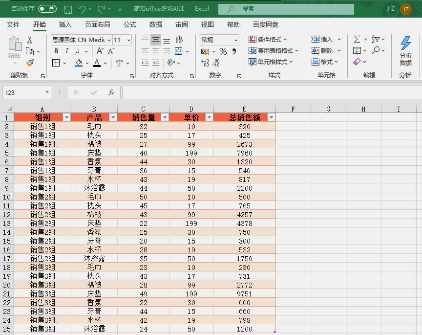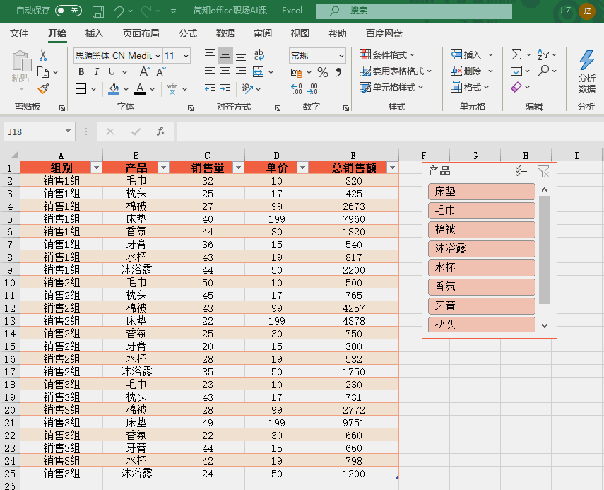 无论是普通Excel表格,还是数据透视表,都能快速插入切片器。以常见的销售数据表格(包含组别、产品、销售量、单价、总销售额)为例,教你一步步操作:第1步:将数据转为“超级表格”
