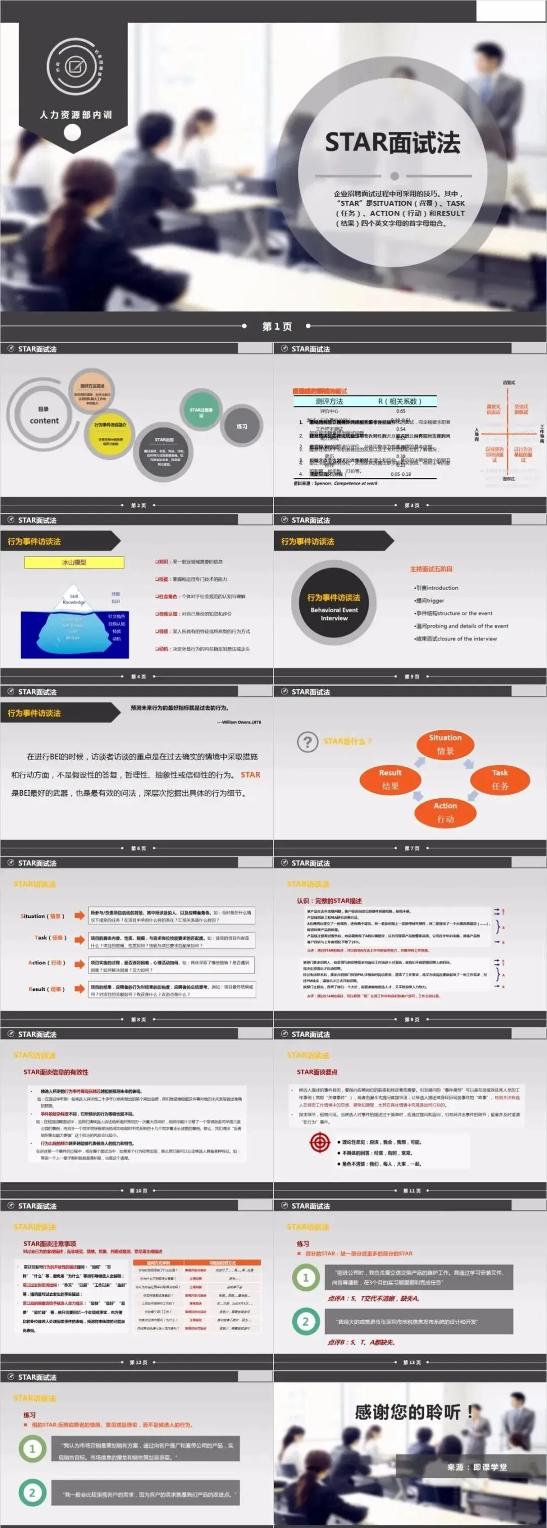 15套面试技巧PPT,制作精美,内容完整,适合自学,以及人力资源部内部培训使用,部分PPT截图展示如下: