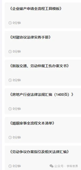 379:公司内控风险点、控制点、控制措施框架和具体实施标准参照体系380:尽职调查清单(私募基金/详细版)(word/pdf版)381:企业合规业务的七大必备工具382:公司并购全流程实务操作指引383:劳动仲裁全套文书(单位版)384:刑事合规业务流程指引手册385:律师谈案邀约手册386:《76部劳动法常用法律法规》《法院、律协发布劳动案件操作手册》387:企业法律顾问实务操作手册388:律师常用办案时限和计算公式389:律师法律检索实践手册