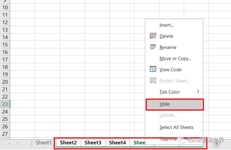 1. 按住 Shift 键,依次点击 Sheet2 和 Sheet7,选中多个工作表 --> 右键单击 --> 在弹出的菜单中选择“隐藏”,就能将第 2 至 7 个工作表同时隐藏起来。