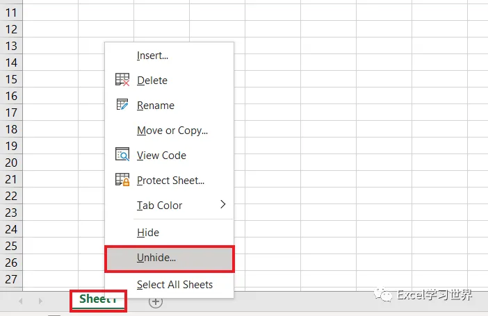 2. 将鼠标放到 Sheet1 标签上 --> 右键单击 --> 在弹出的菜单中选择“取消隐藏”