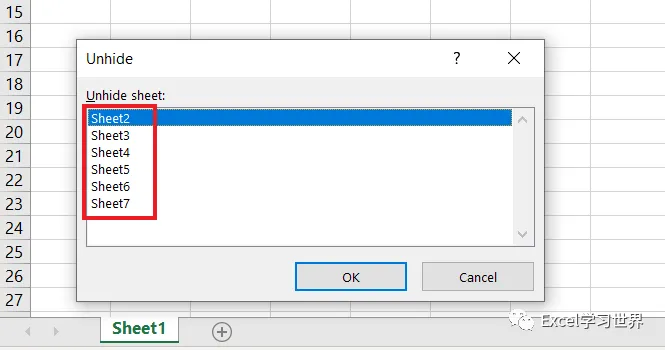 3. 在弹出的对话框中能看到所有隐藏的工作表,但是!按住 Shift 键却无法多选,只能选中一个工作表,将其取消隐藏。