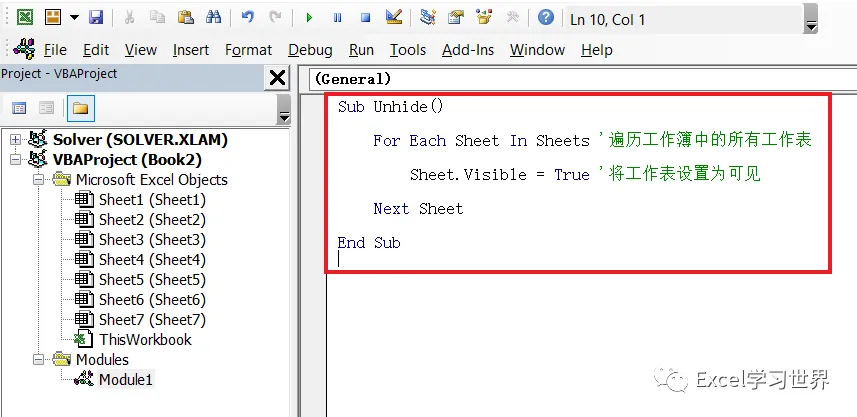 SubUnhide()ForEach Sheet In Sheets '遍历工作簿中的所有工作表Sheet.Visible = True '将工作表设置为可见NextSheetEndSub
