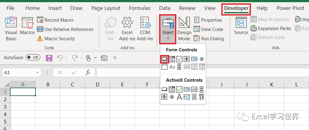6. 关闭 VBE,回到 Excel --> 选择菜单栏的“开发工具”-->“插入”-->“按钮(窗体控件)”