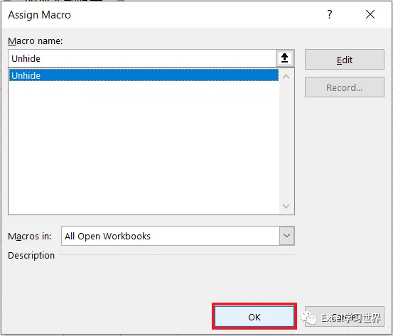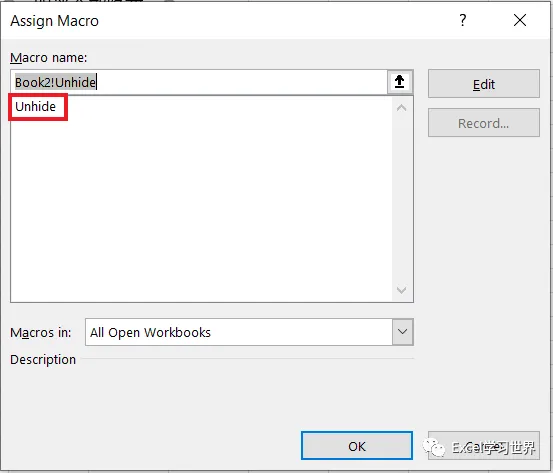 10. 在弹出的菜单中选择刚才编写的模块 Unhide --> 点击“确定”