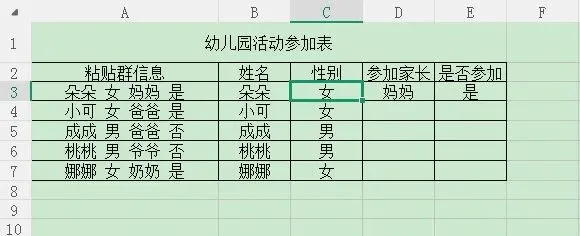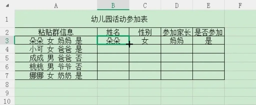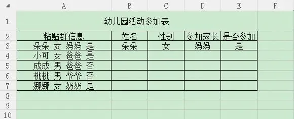 想象一下,你拿到一份长长的名单,所有孩子的姓名和年龄都挤在同一个单元格里。像“朵朵女妈妈参加”,“小可女爸爸参加”这样。以前你是不是得小心翼翼地手动分开,或者用复杂的函数公式?现在,只需“Ctrl+E”,瞬间帮你把信息整理得清清楚楚。