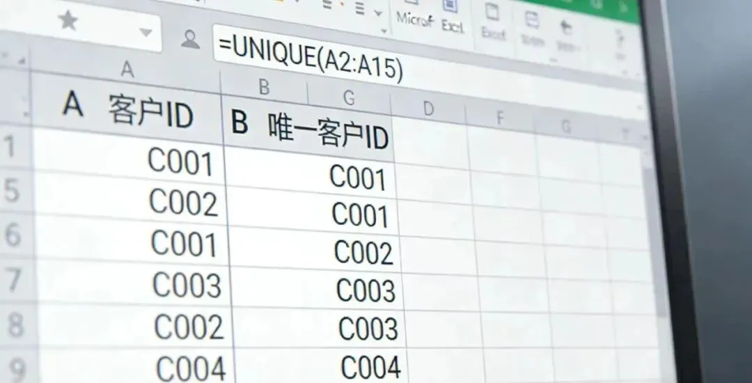 =UNIQUE(数据区域) ,比如 =UNIQUE(A2:A100) ;A2:A100 是待处理的数据区域;按下回车,瞬间得出区域内无重复的所有数据;如果需要按行提取唯一值,可添加参数写成 =UNIQUE(A2:C100,TRUE) ,TRUE 代表按行处理,FALSE(默认)按列处理。