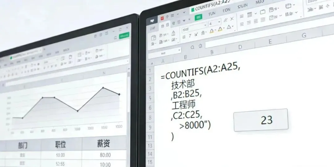 =COUNTIFS(条件区域1,条件1,条件区域2,条件2) ,比如 =COUNTIFS(A2:A50,"华东区",B2:B50,"产品B") ;A 列是区域信息,B 列是产品名称;回车即可得出华东区产品 B 的销售单数;添加更多条件只需继续补充 “条件区域 + 条件”,数值条件写 >80 这类表达式时,记得加英文双引号。