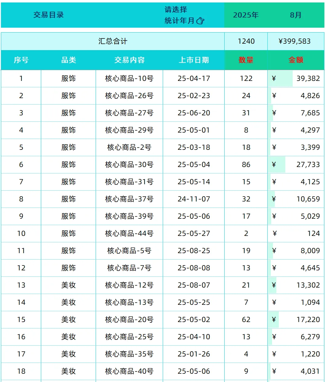 • 分析图表:销售分析组合图、Top排行榜、环比分析、品类占比饼图、每日分析折线图、时刻分析折线图• 交易目录(销售查询)可动态查询各月所有产品销售数据明细