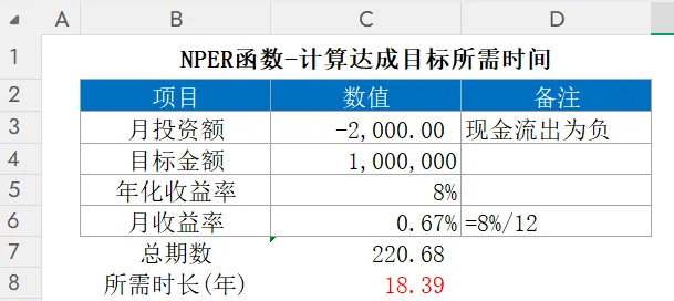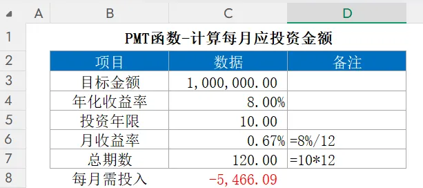 案例2:假设你的财务目标是10年后积累100万元,预计年化收益率8%。函数公式:=PMT(8%/12, 10*12, 0, 1000000, 0)函数结果为:-5466.09。该函数的含义:10年想积累100万元,按照8%的年化收益率来计算,每月需要投入5466元。函数语法:=NPER(利率, 每期付款额, 现值, [未来值], [期初或期末])