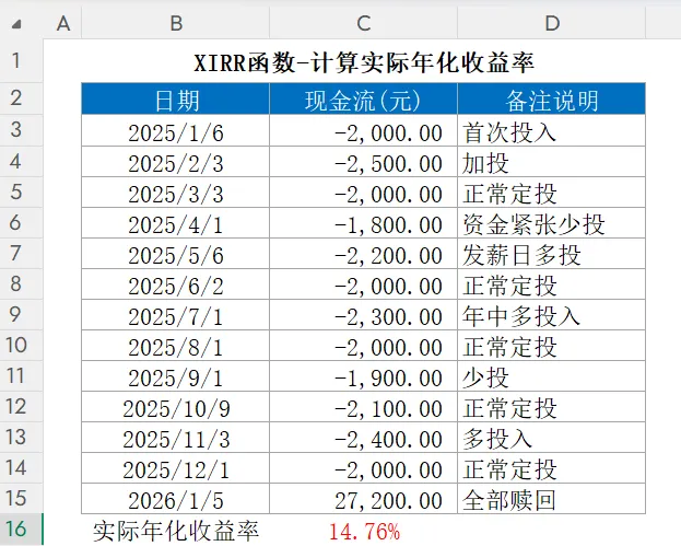 案例4:假设你从2025年1月6号开始进行定投,共计定投了12期,在2026年1月8号全部赎回,定投投资的年化收益率是多少呢?函数公式:=XIRR(C3:C15,B3:B15)- B列 (B3:B15):实际发生的日期函数结果:14.76%。该函数的含义:该投资的实际年化收益率是14.76%。