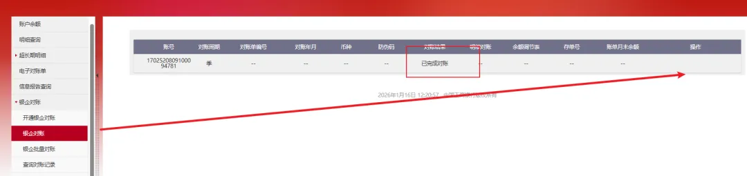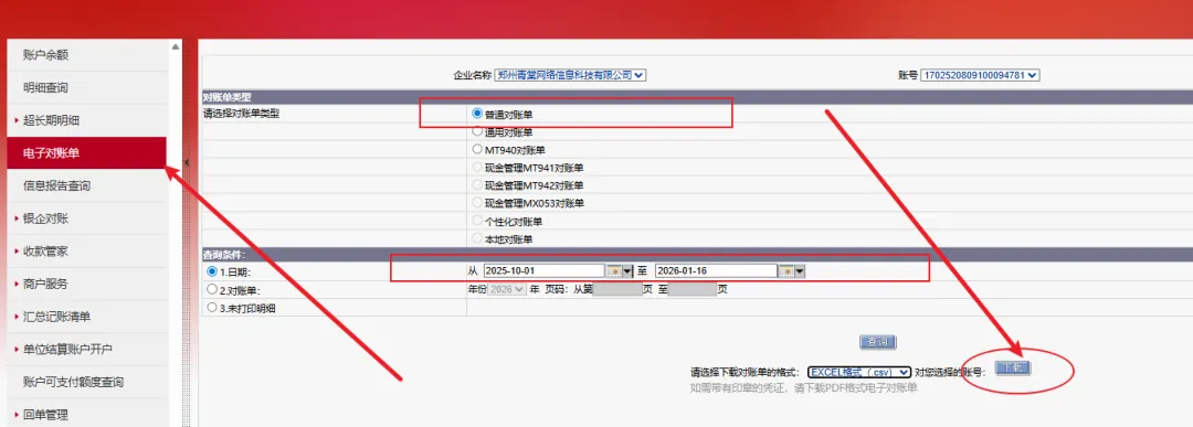 1. 在同一个查询页面,下拉到最下方,勾选全部交易,选择“下载回单”选择“账户管理”->“银企对账”,选择余额已平,将没有对账的进行对账操作即可。