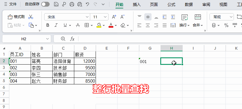 整行查找:查找“001”员工的姓名和部门,只需选择需要填充的多个单元格,设置返回数组为包含姓名和部门的列区域
