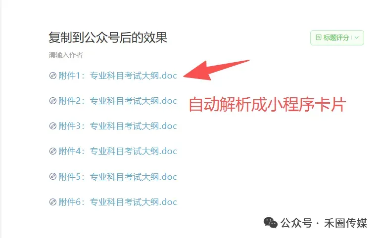 现在很多企事业单位也会开通自己的公众号,用于发布招聘信息、产品信息等。人力资源公众号:发布招聘信息 ,需要添加/插入岗位报名word、pdf、excel等文档附件;企事业单位公众号:同城政务的发布公告名单表,也需要添加/插入word、pdf、excel等文档附件;各大院校公众号:文章都需要添加招生招生简章、报名表文档附件等。除了文字、图片外,音频、视频、小程序都可以展示在公众号文章中,但公众号文章怎么添加附件?微信公众号附件上传入口在哪里?今天帮你轻松解决,如何快速在微信公众号文章插入附件文档到公众号文章。无论是招聘信息表、获奖名单、模板信息表,还是承诺书、说明书、招标书都能轻松上传。这个就是让我工作效率倍增的神器——“禾圈文档”小程序,它彻底解决了公众号上传附件的难题。“禾圈文档”是一款专为公众号运营者设计的小程序,该小程序把复杂数据表格及文档快速上传,能在公众号文章中直接插入可下载的附件,读者无需下载即可在线查看!• 支持多种格式:支持文档(pdf、doc、docx、xls、xlsx、ppt、pptx)格式,上传单个文件最大50MB,文件名长度1-100个字符;• 在线预览与下载:读者可选择在线预览查看或直接下载;使用“禾圈文档”在公众号插入附件,只需以下4个简单步骤:1、在微信搜索“禾圈文档”小程序,点击进入直接可以使用。2、点击“上传文件”,从聊天记录或文件助手中选择需要上传的文件上传。3、上传成功后,在文件管理页面找到刚上传的文件,点击“一键复制粘贴”按钮,跳转到下个页面,点击“一键复制”。点击下方名片,看更多融水大小事