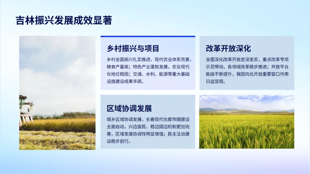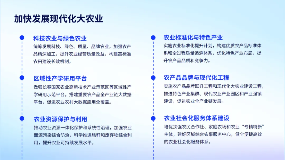 乡村振兴与区域协调:争当现代农业建设排头兵,加快发展现代化大农业;统筹区域协调发展,重点加快推进长春现代化都市圈建设,打造全省经济增长主引擎。