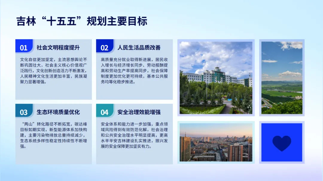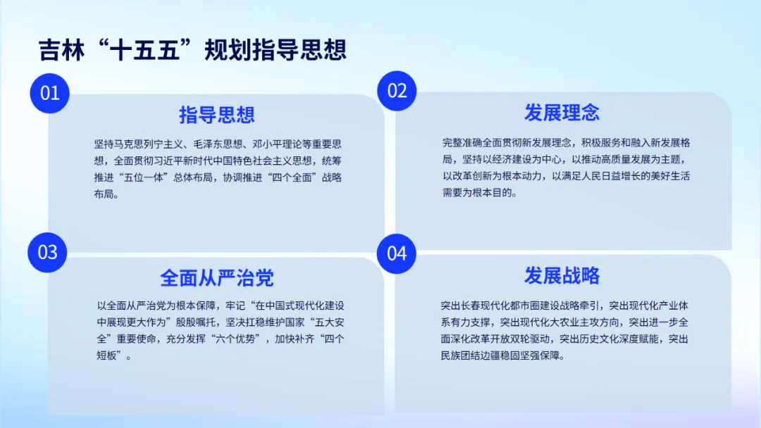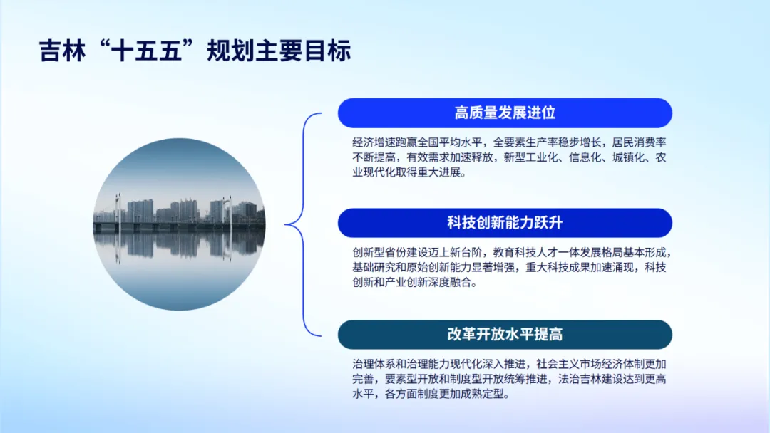 吉林省“十五五”规划以全面建设社会主义现代化新吉林为主线,聚焦实现高质量发展明显进位、全面振兴取得新突破。核心目标是巩固优势、破除瓶颈,构建体现吉林特色的现代化产业体系。