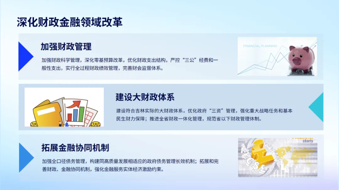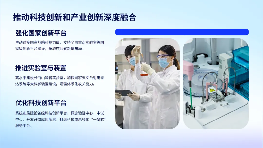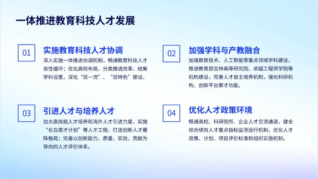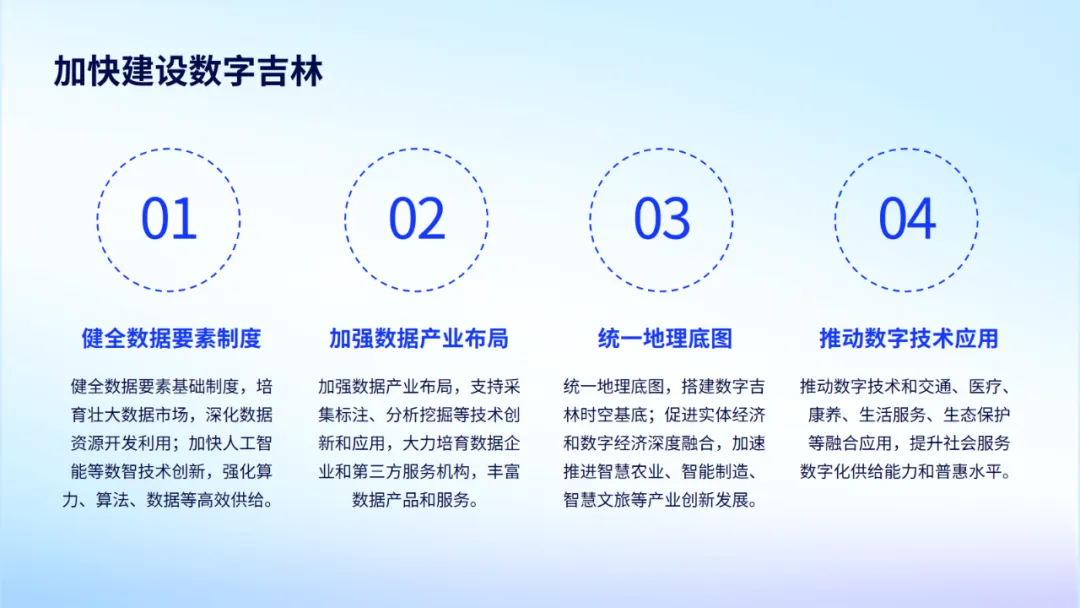 科技创新:加强原始创新和关键核心技术攻关,推动科技创新与产业创新深度融合,统筹教育、科技、人才一体化发展,加快建设“数字吉林”。