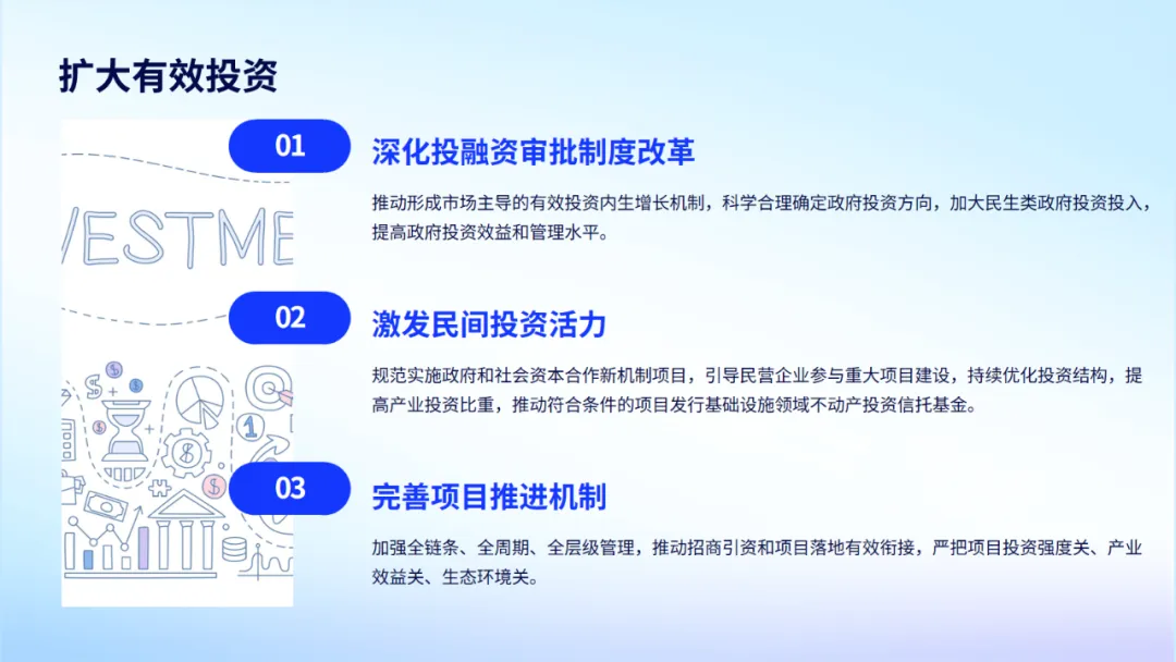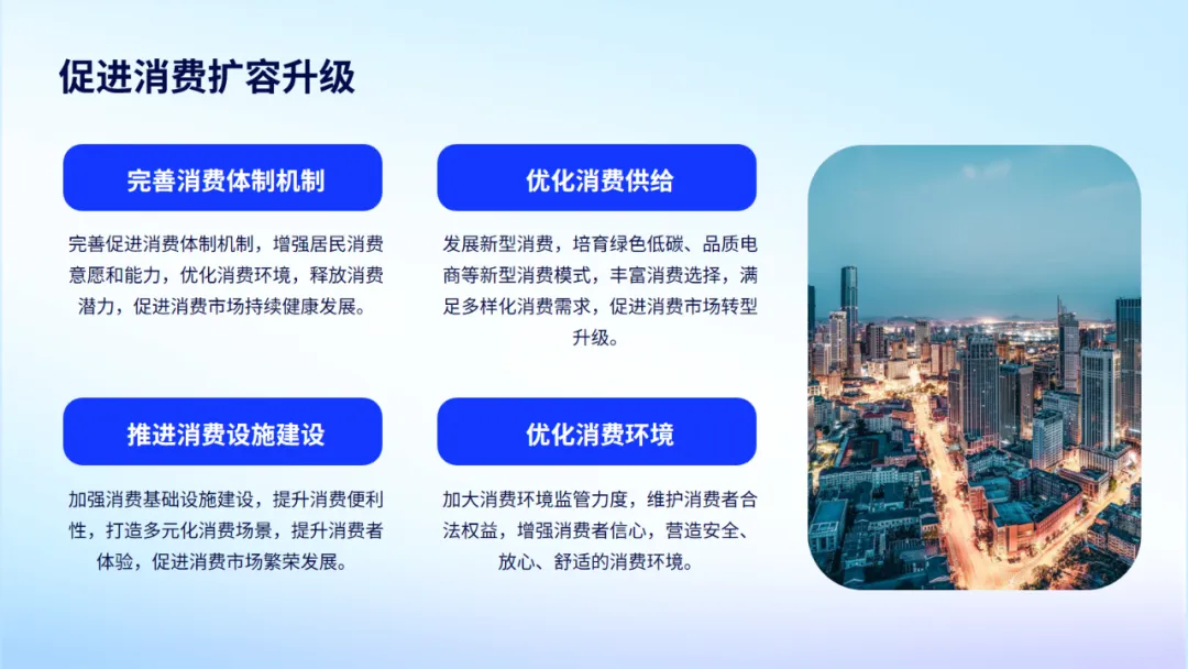 扩大内需:促进消费扩容升级,扩大有效投资,构建现代化基础设施体系。