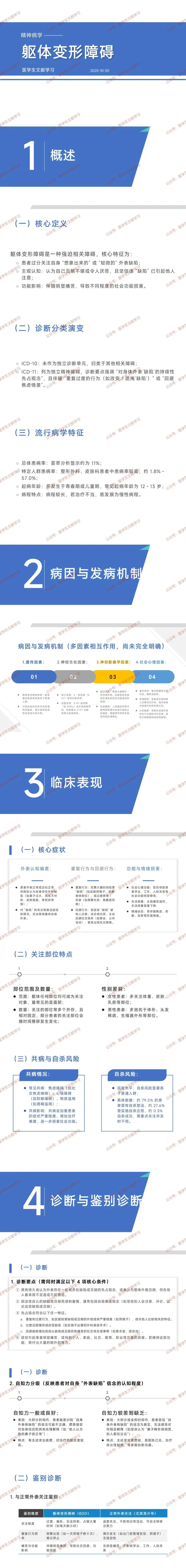 - 核心定义:属强迫相关障碍,患者过分关注自身 “想象或轻微的” 外表缺陷,坚信缺陷已引起他人注意,伴随明显痛苦,导致不同程度社会功能损害。
