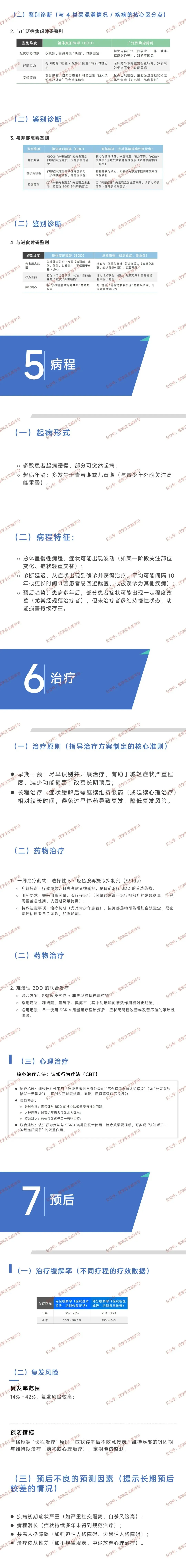 - 与抑郁障碍鉴别:BDD 核心是外表缺陷先占观念,抑郁为继发且随外表焦虑波动;抑郁障碍核心是情绪低落,外表相关想法为继发或精神病性症状,不随情绪波动明显变化。